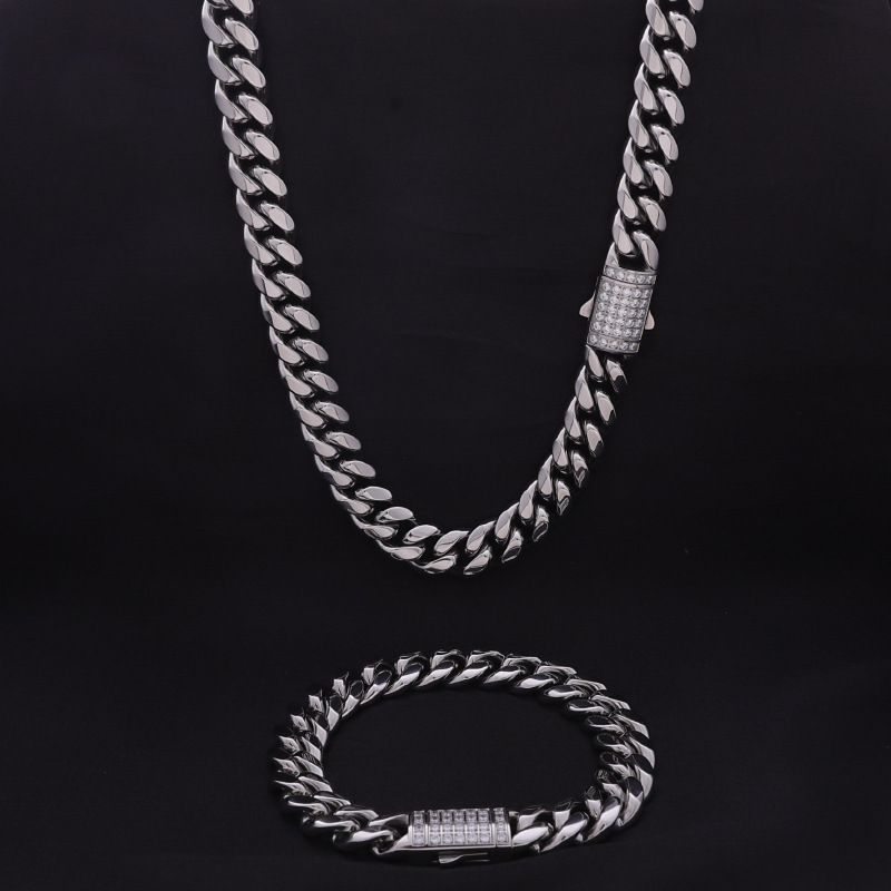 European and American Hip-hop Style Polished Stainless Steel Cuban Link Chain Set with Vacuum-plated Zircon and Press-lock Clasp