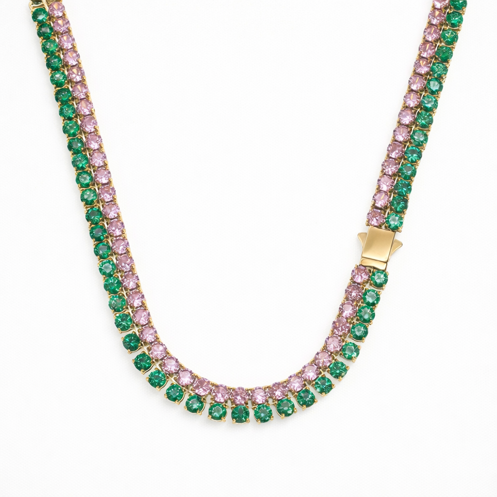 Tennis chain types include Choker – A shorter chain designed to sit higher on the neck,Graduated – Includes gradually increasing sizes of diamonds/ gemstones,Baguette – Features baguette-cut diamonds/gemstones (instead of round-cut diamonds),Floating – Features a thin metal chain designed to create the illusion that the stones are suspended,Double Row – Features two rows of gems or diamonds (instead of a single row),Clustered – Includes center stones with halos of smaller stones around them,Colored – Includes colored diamonds or gemstones (instead of colorless).